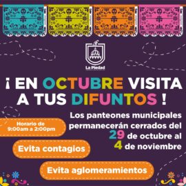 La Piedad Michoacán a 14 de Octubre del 2020.- Debido a que las condiciones sanitarias a nivel estatal no han cambiado, autoridades municipales sostienen el acuerdo de mantener cerrados los panteones locales del 29 de octubre al 4 de noviembre. Por lo anterior, el director de Servicios...