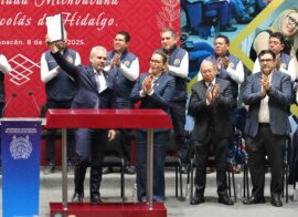 Morelia, Michoacán, 8 de enero de 2025.- Ante el pleno de la comunidad universitaria, el gobernador Alfredo Ramírez Bedolla firmó el Decreto de Promulgación de la Reforma Constitucional a la Universidad Michoacana de San Nicolás de Hidalgo (UMSNH), garantizándose así la asignación del 4.5 por ciento del presupuesto...