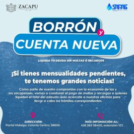 Zacapu, Michoacán a 07 de Diciembre de 2024. Como parte del compromiso con la economía de las y los zacapenses, el Gobierno de Zacapu, a través del Sapas, dio a conocer que continúa el programa “Borrón y cuenta nueva” hasta el 15 de diciembre. Con este programa se...