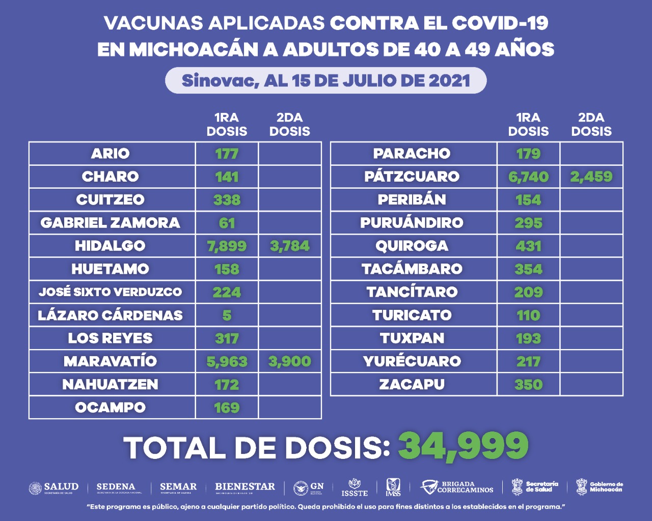 Morelia, Michoacán, a 15 de julio de 2021.- En la entidad se han aplicado 348 mil 396 dosis de la vacuna anti-COVID-19 a personas de entre 40 y 49 años de edad, informó la Secretaría de Salud de Michoacán (SSM).