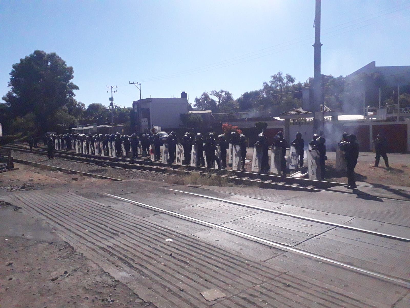 Asimismo, distintos grupos de la Unidad de Restablecimiento para el Orden Público (UROP), resguardan las vías del tren, lugar que en días anteriores y de manera violenta, varios manifestantes intentaron bloquear, por lo que de acuerdo con los protocolos de actuación se dispersó a los presuntos docentes.