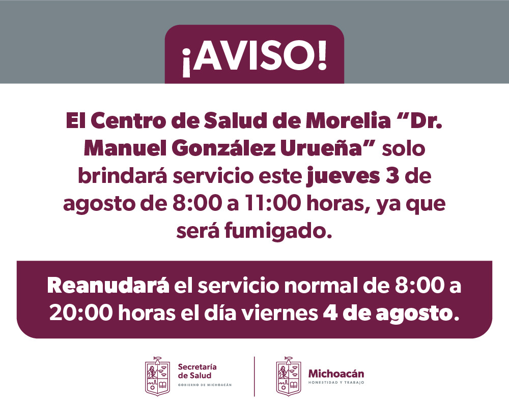 Morelia, Michoacán a 02 de Agosto de 2023.- La Secretaría de Salud de Michoacán (SSM) anuncia a la población que este jueves 3 de agosto serán suspendidos los servicios médicos a partir de las 11:00 horas en el Centro de Salud Urbano de Morelia Manuel González Urueña, por trabajos de fumigación.