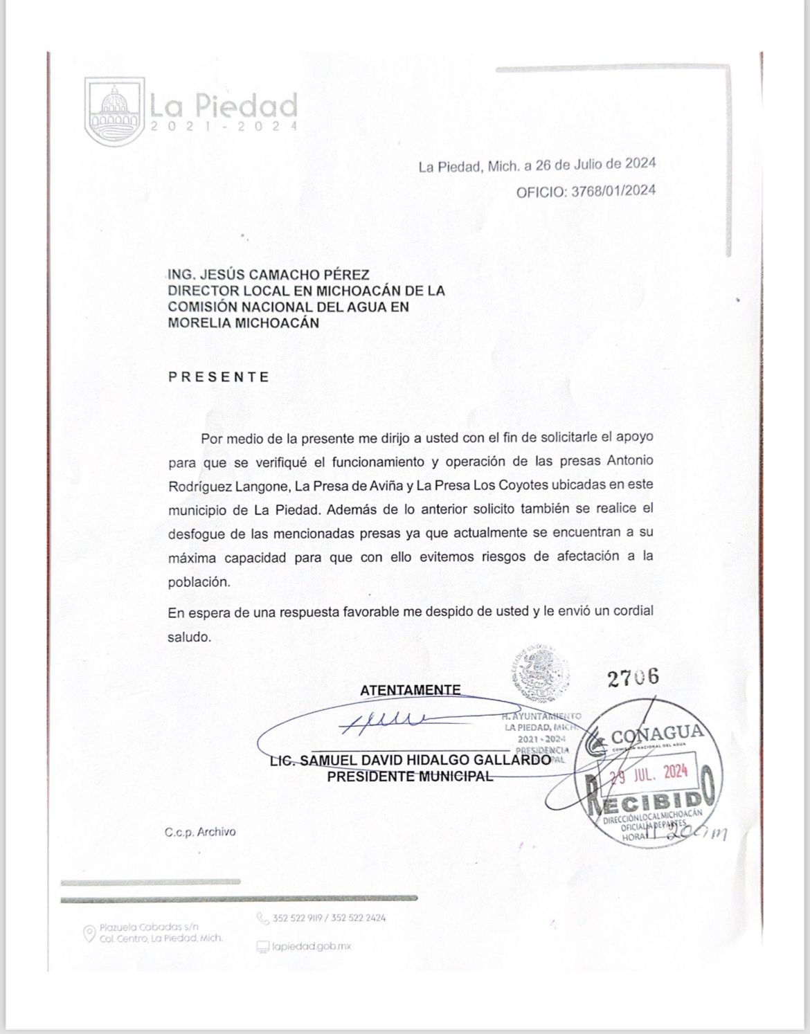 La Piedad, Michoacàn a 30 de Julio del 2024.- Debido a las lluvias torrenciales, de las cuales no se tenían registro en los últimos años en el municipio de La Piedad, se informa que el Presidente Municipal Samuel Hidalgo, ha solicitado de manera reiterada, tanto de forma verbal como por escrito, a la Comisión Nacional del Agua (CONAGUA) en el Estado de Michoacán, se verifique el funcionamiento de las presas que se encuentran en su máxima capacidad.