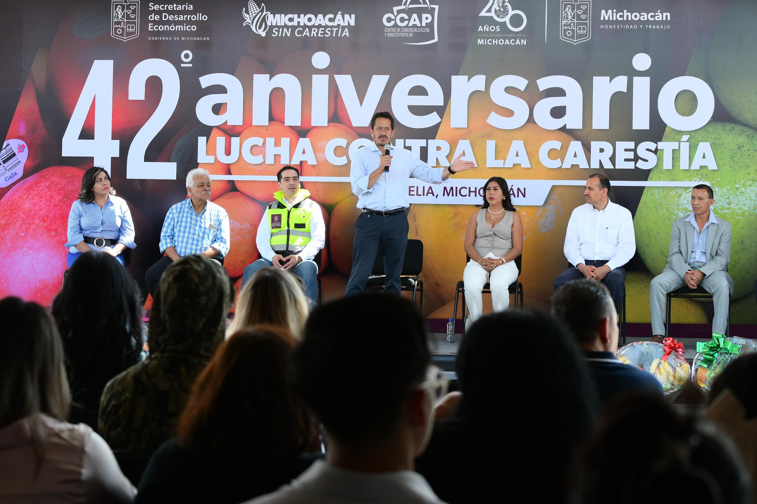 Morelia, Michoacán, 23 de Septiembre de 2024.- El Programa Lucha Contra la Carestía que opera la Secretaría de Desarrollo Económico (Sedeco) en cinco tianguis, cumple 42 años y lo celebra con una inversión superior a los 10 millones de pesos aportados por la dependencia y la Secretaría de Comunicaciones y Obras Públicas (SCOP).