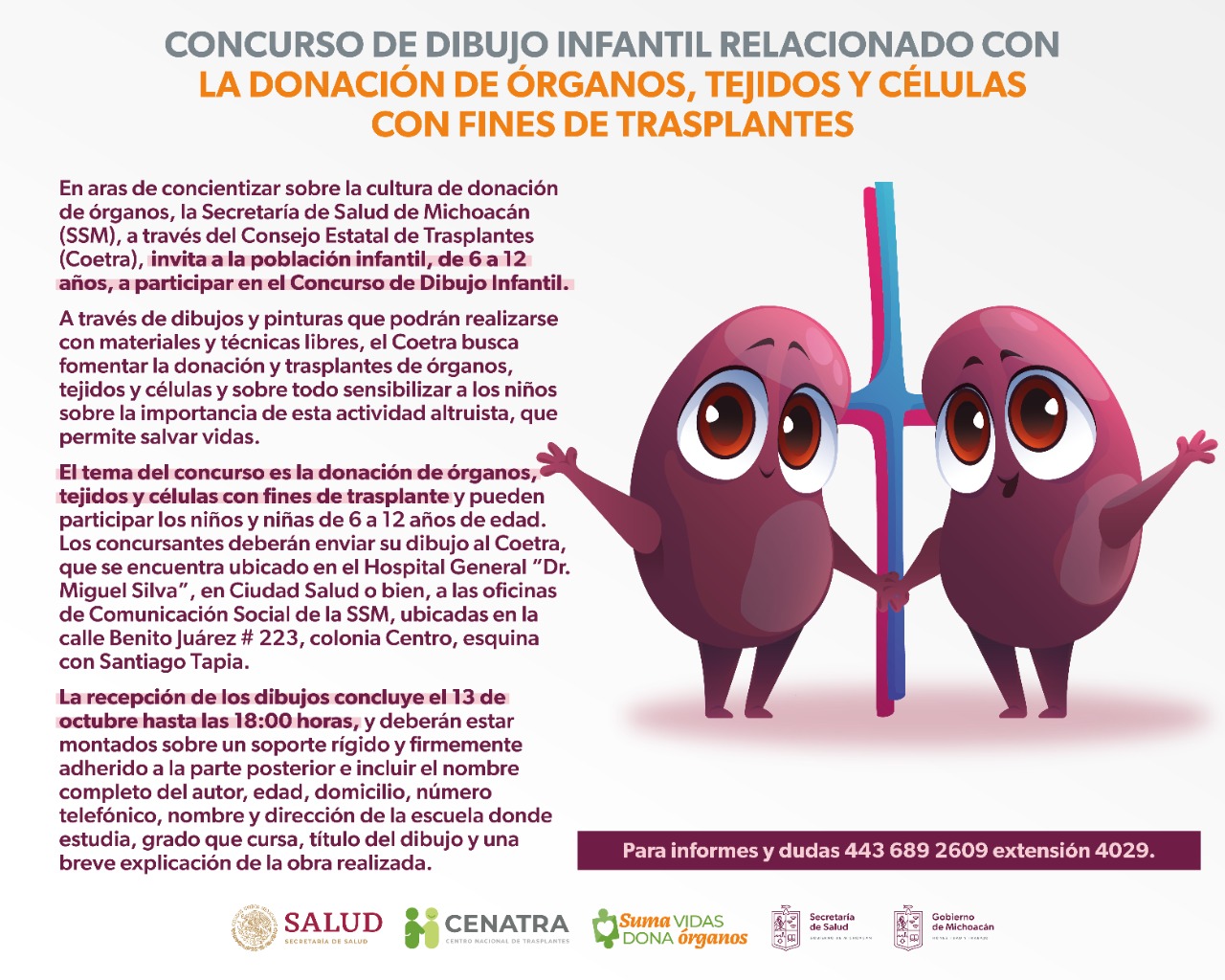 El tema del concurso es la donación de órganos, tejidos y células con fines de trasplante y pueden participar los niños y niñas de 6 a 12 años de edad. Los concursantes deberán enviar su dibujo al Coetra, que se encuentra ubicado en el Hospital General “Dr. Miguel Silva”, en Ciudad Salud o bien, a las oficinas de Comunicación Social de la SSM, ubicadas en la calle Benito Juárez # 223, colonia Centro, esquina con Santiago Tapia.