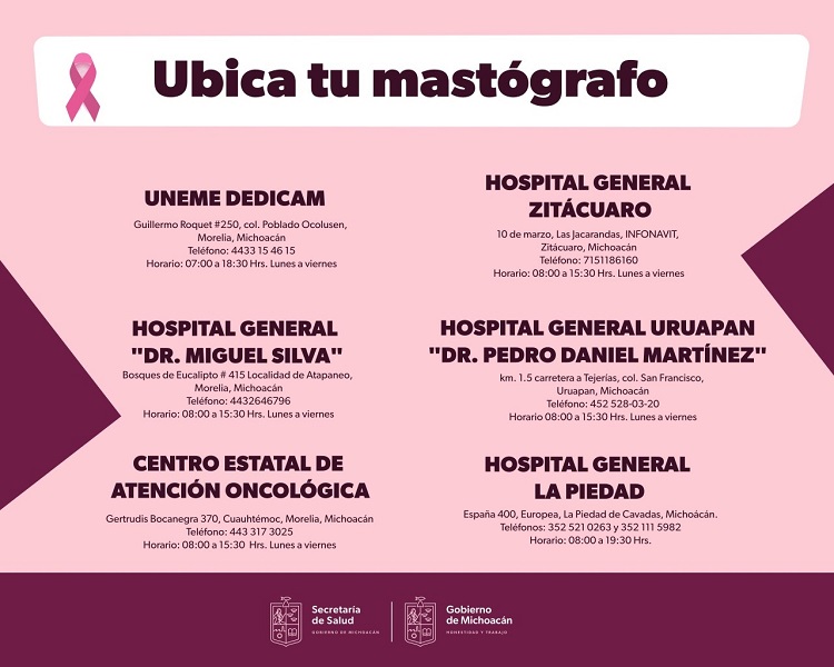 Morelia, Michoacán a 08 de Octubre del 2022.- En el marco del Día Mundial de la Lucha contra el Cáncer de Mama, el Sistema para el Desarrollo Integral de la Familia (DIF) Michoacán, en coordinación con la Secretaría de Salud de Michoacán (SSM), suma esfuerzos para la detección y atención oportuna del cáncer de mama. La presidenta honoraria del DIF, Grisel Tello Pimentel, exhortó a la población a tomar conciencia sobre la importancia de realizarse chequeos periódicos a fin de detectar oportunamente la enfermedad. A su vez señaló que, junto a la SSM, asociaciones civiles y el Gobierno Federal, se realizan gestiones para brindar prótesis, expansores e implantes mamarios, para las pacientes que los necesiten.De acuerdo con datos de la SSM, el Cáncer de Mama es uno de los padecimientos oncológicos más frecuentes en las mujeres de 40 años en adelante, superando incluso al cervicouterino. Por ello, a través de jornadas de mastografías gratuitas en hospitales, así como en la Unidad de Especialidades Médicas dedicada al Cáncer de Mama (UNEME DEDICAM), se trabaja de manera permanente en la prevención y detección a tiempo de esta enfermedad.Destacar que las instituciones a las que la población puede acercarse a realizarse las mastografías son: la UNEME DEDICAM, el Hospital General “Dr. Miguel Silva”, Hospital General de Zitácuaro, Hospital General de Uruapan “Dr. Pedro Daniel Martínez”, el Centro Estatal de Atención Oncológica y el Hospital General de La Piedad.