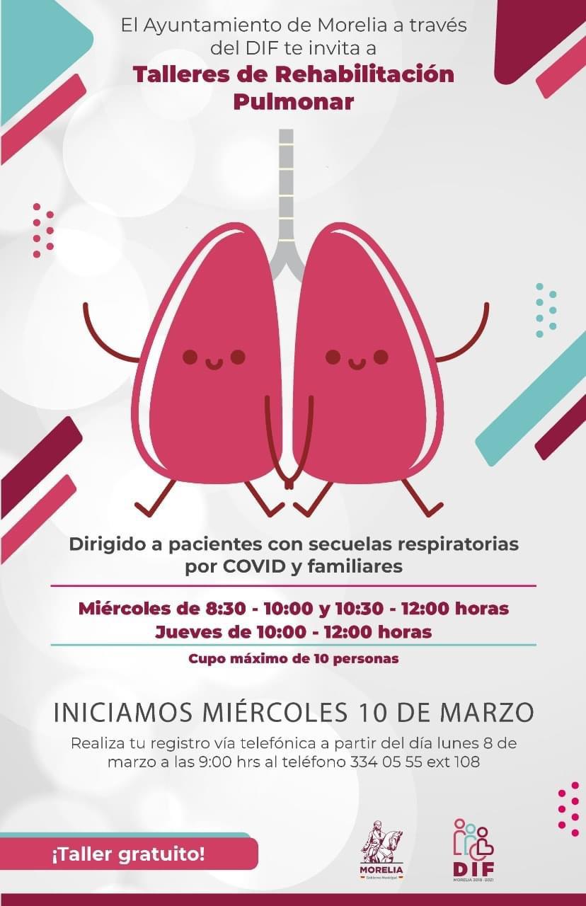 La directora general del DIF Municipal, Alejandra Corona González, informó que en el Centro para la Cultura de la Discapacidad del DIF, se llevará a cabo una serie de talleres para personas con secuelas respiratorias, y de este modo mejorar la calidad de vida posterior a esta enfermedad.
