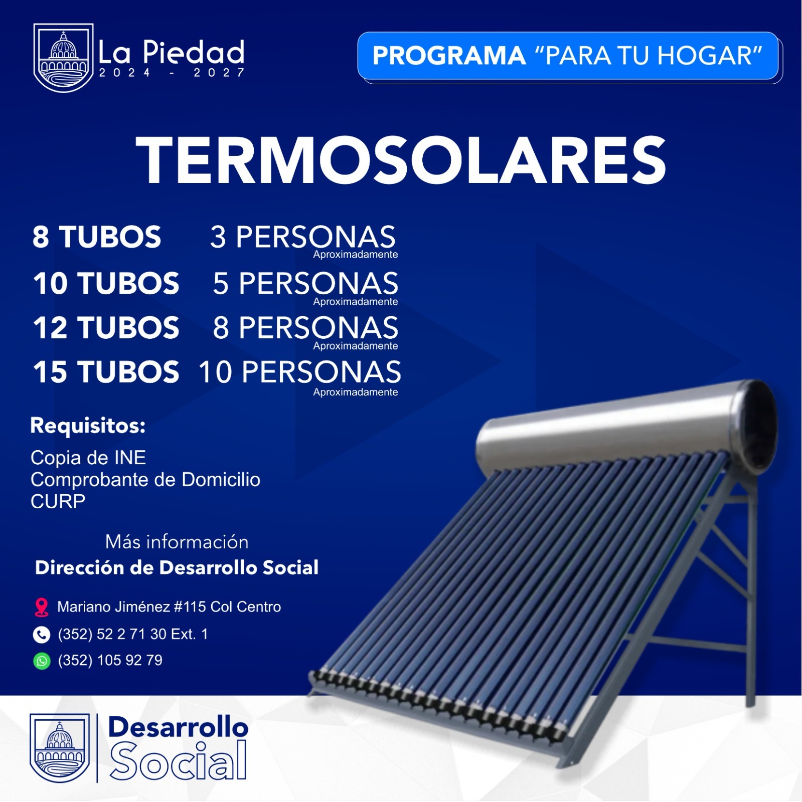 Asimismo, el funcionario destacó que la Dirección de Desarrollo Social, también está promoviendo el programa “Para tu hogar”, y que de momento los piedadenses pueden obtener termosolares con capacidad de 8 a 15 tubos.