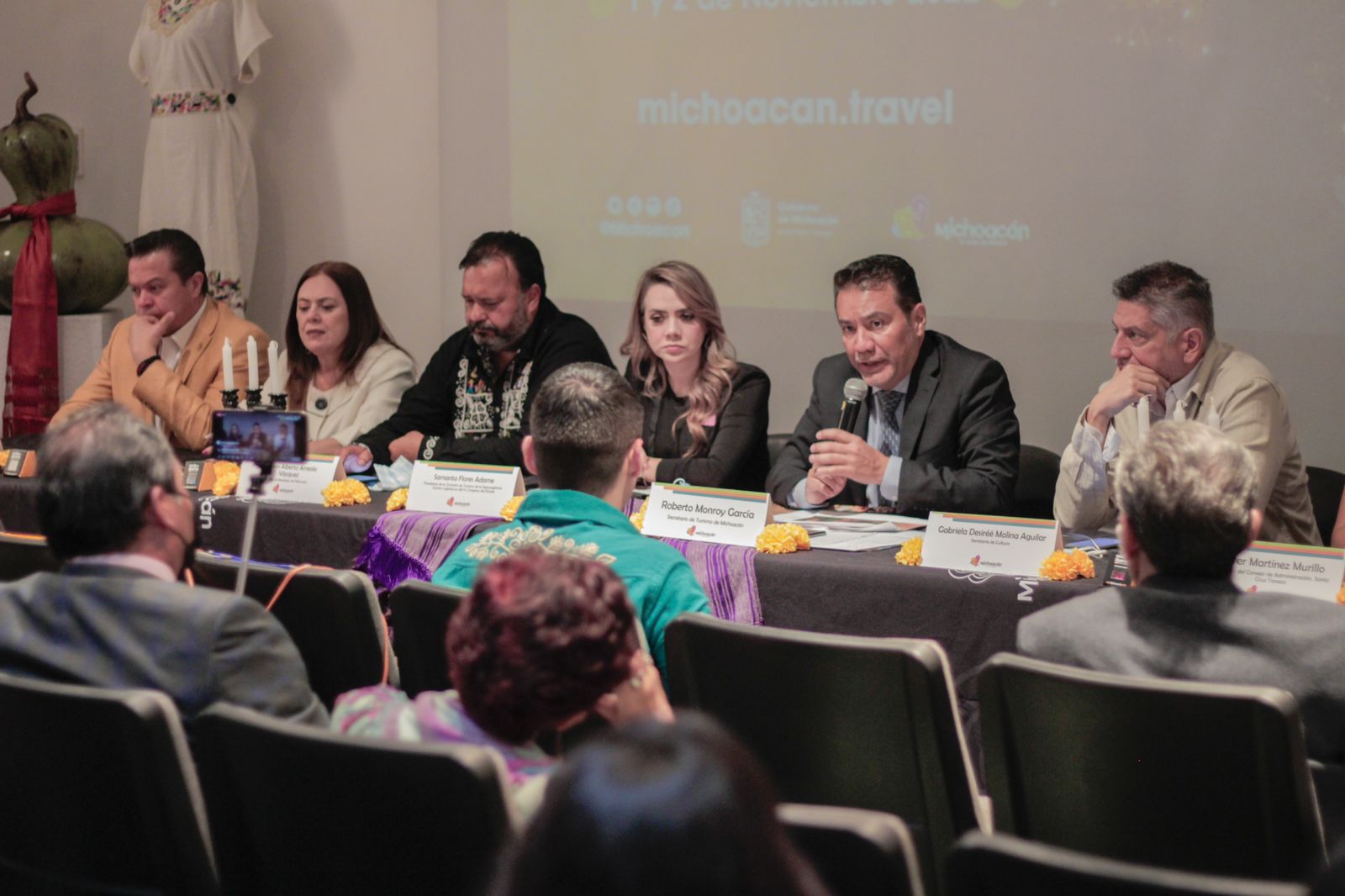 Durante la conferencia también estuvieron presentes Julio Blasina Palermo, en representación de Gabriela Molina Aguilar, secretaria de Cultura; la diputada Samanta Flores Adame, presidenta de la Comisión de Turismo del Congreso del Estado; Cástor Estrada Robles, director General del Instituto del Artesano Michoacano; en representación de los Pueblos Originarios, Jenifer Martínez Murillo, presidenta del Consejo de Administración; Julio Alberto Arreola Vázquez, presidente municipal de Pátzcuaro; Arturo Estrada Barriga, presidente municipal de Quiroga, Teresita Beatriz Pérez Torres, presidenta de AHMEMAC y Fernando Figueroa Silva, presidente de la CANIRAC.