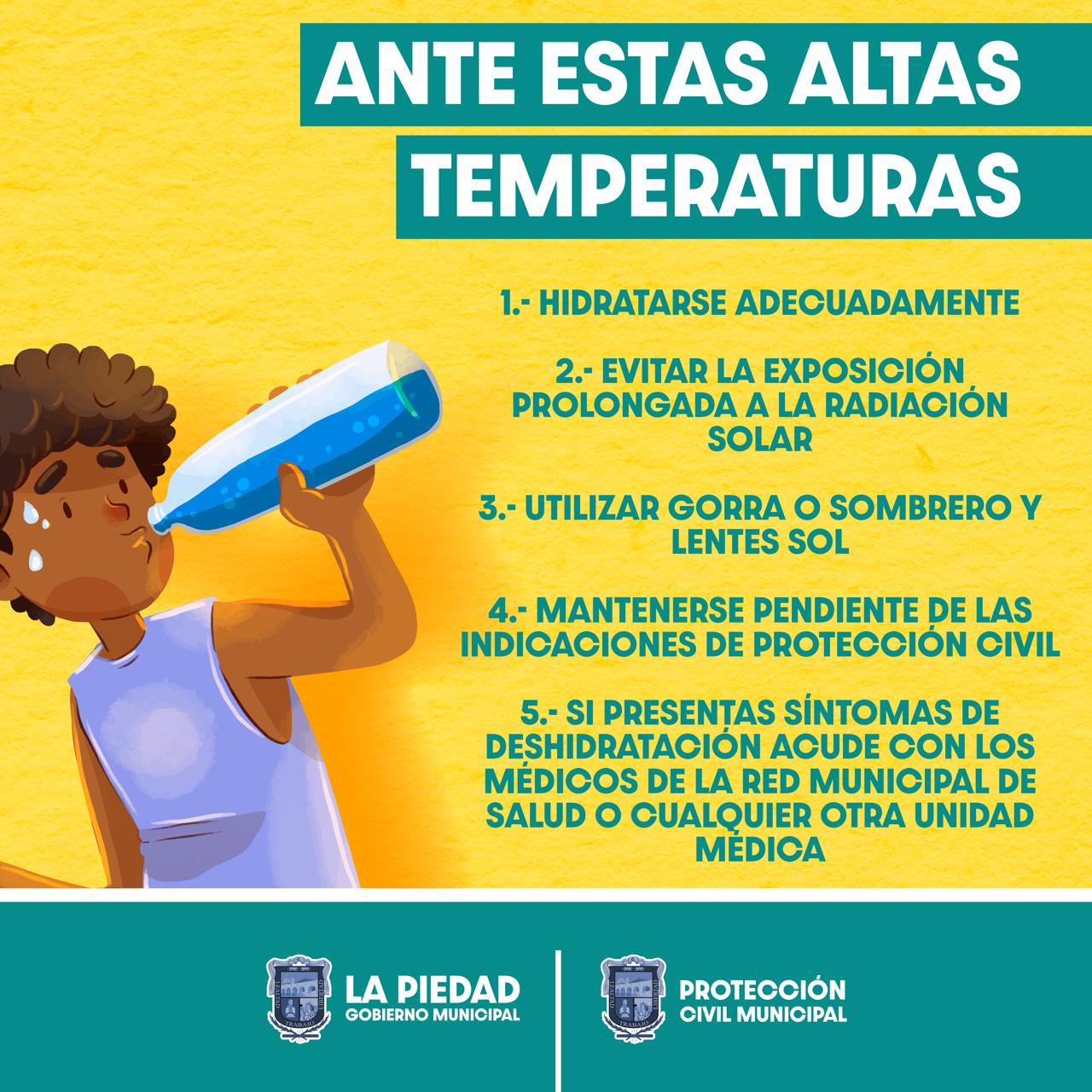La Piedad, Michoacàn a 09 de Mayo del 2024.- A través de la dependencia de Protección Civil Municipal (PCM), el Gobierno de La Piedad, comunica que la segunda ola de calor que prevalece en el Estado y en gran parte del país, seguirá hasta el día sábado 11 de este mes.