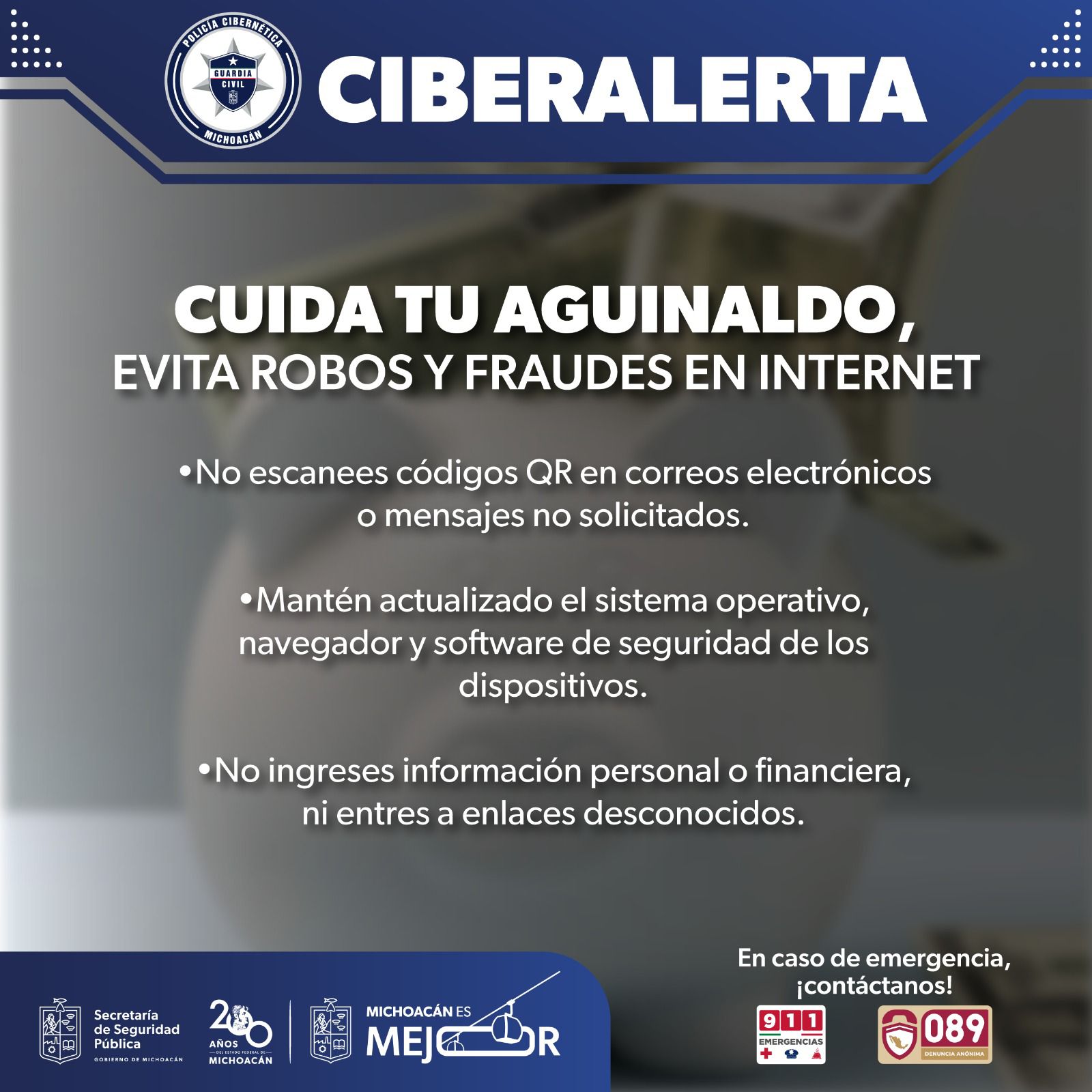 Morelia, Michoacán, 19 de Diciembre de 2024.- El comercio electrónico es uno de los principales canales para adquirir regalos durante la temporada navideña, periodo en el que incrementan los ciberdelitos. La Secretaría de Seguridad Pública (SSP) lanza la campaña Antifraude Cibernético, con el fin de ayudar a las y los usuarios a prevenir que se conviertan en cibervíctimas.