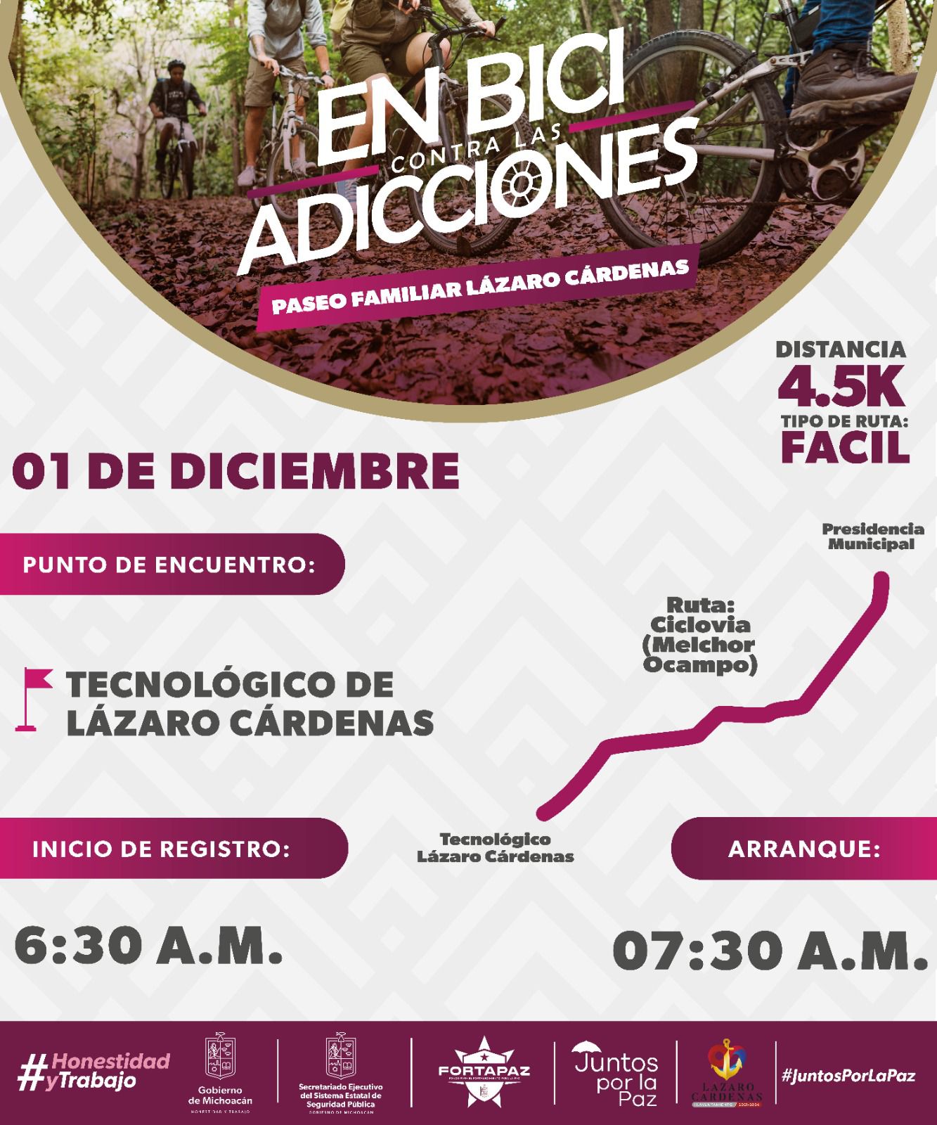 Cd. Lázaro Cárdenas, Michoacàn a 28 de noviembre 2023.- En un esfuerzo conjunto entre el Gobierno Municipal de Lázaro Cárdenas y el Gobierno del Estado, en base al programa Nacional Prevención Social de la Violencia y Delincuencia con Participación Ciudadana, se llevará a cabo la rodada “Bici Contra las Adicciones”, por lo que se convoca a la participación a alumnos de diversas instituciones educativas, clubes deportivos y a la sociedad en general.