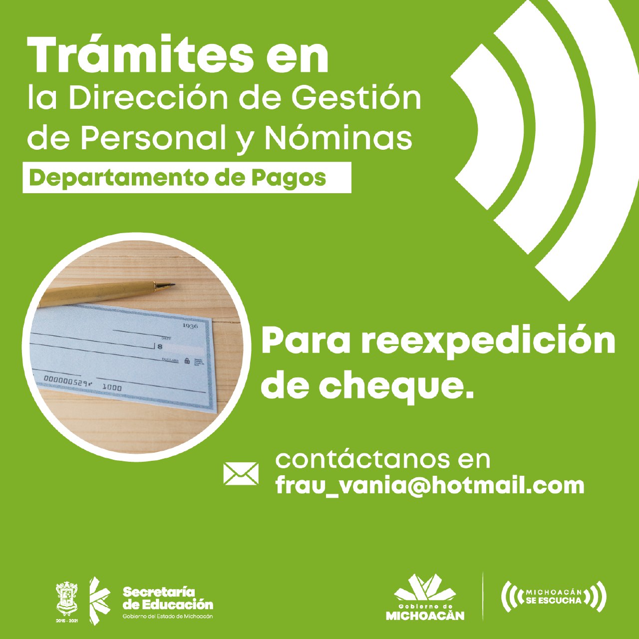 Asimismo, para altas y bajas del ISSSTE se ha puesto a disposición el correo altassep20@hotmail.com; para estímulos por años de servicio podrán comunicarse al número 4434149777 o en el correo estimulosmichoacan@hotmail.com; expedición de cheques en el frau_vania@hotmail.com y para personal con retención por falta de documentación en el teléfono 4432079250 o en documentaciones42@gmail.com.