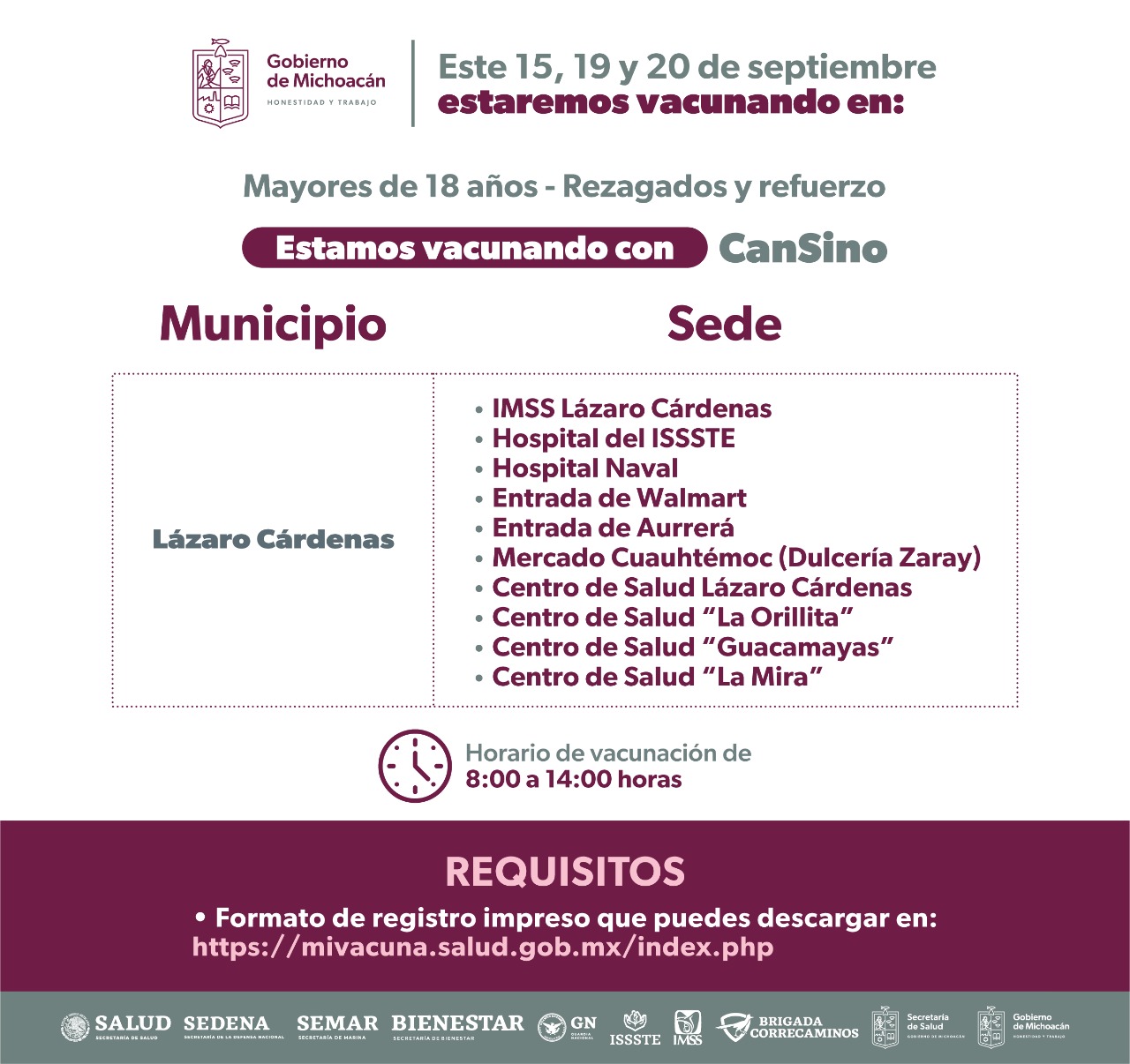 Morelia, Michoacán a 16 de Septiembre del 2022.- A partir de este lunes 19 de septiembre, se reactivará en Lázaro Cárdenas la Jornada Nacional de Vacunación anti COVID-19 para población rezagada y de refuerzo dirigida a mayores de 18 años.