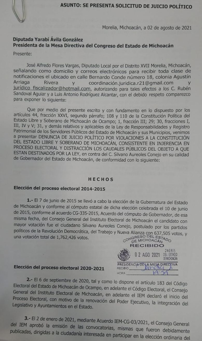 Morelia, Michoacán, 3 de agosto de 2021.- El Congreso del Estado de Michoacán recibió este lunes la solicitud de juicio político en contra del gobernador Silvano Aureoles, a quien se le acusa de violar la soberanía y libertad del estado, y por faltar a sus responsabilidades como servidor público.