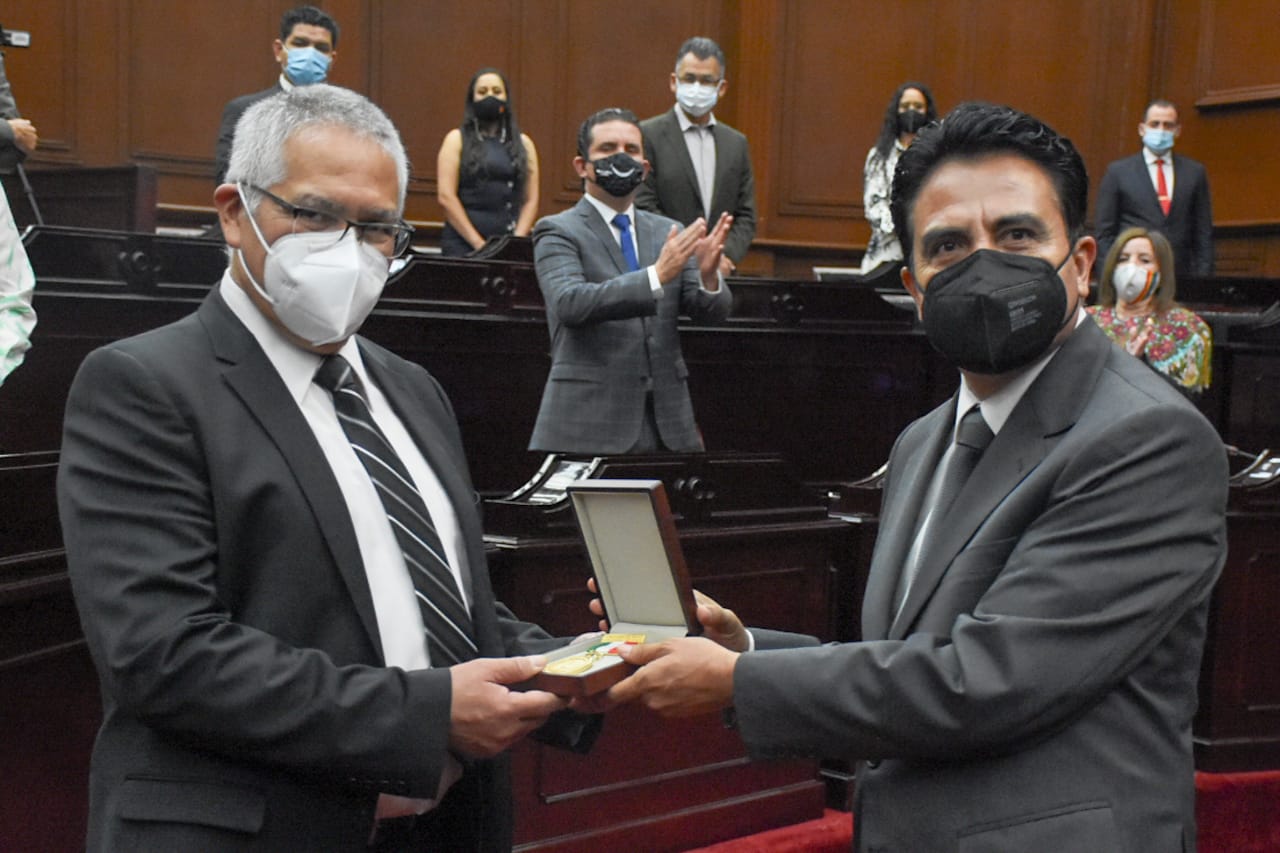 Durante la Sesión Solemne llevada a cabo en el recinto legislativo, el encargado de recibir la condecoración a nombre de todo el personal, administrativo y operativo, fue el director de dicha unidad médica, el doctor Raúl Leal Cantú.