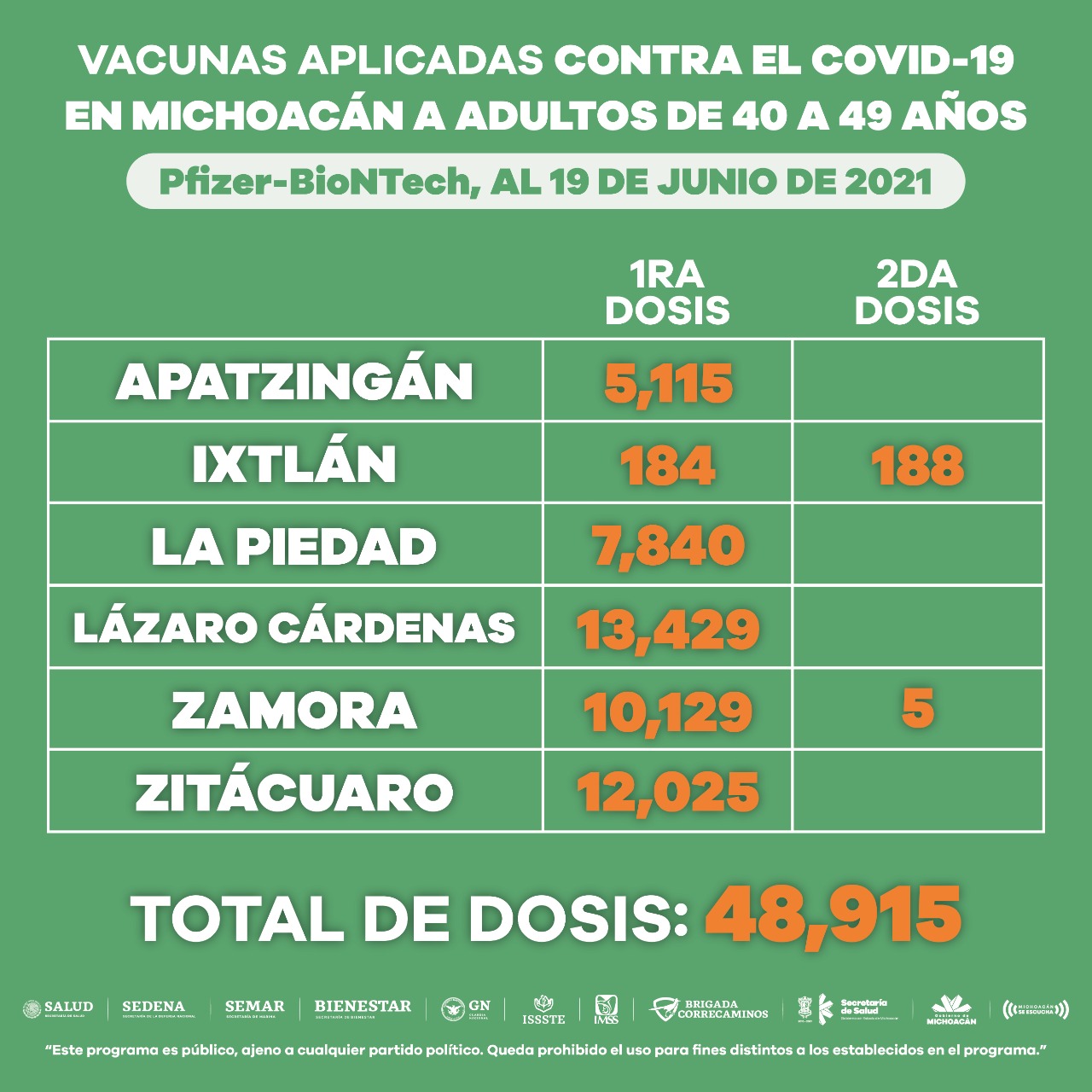 Morelia, Michoacán, a 19 de junio de 2021.- En la entidad se han aplicado 106 mil 413 dosis de la vacuna anti-COVID-19 a personas de entre 40 y 49 años de edad, informó la Secretaría de Salud de Michoacán (SSM).