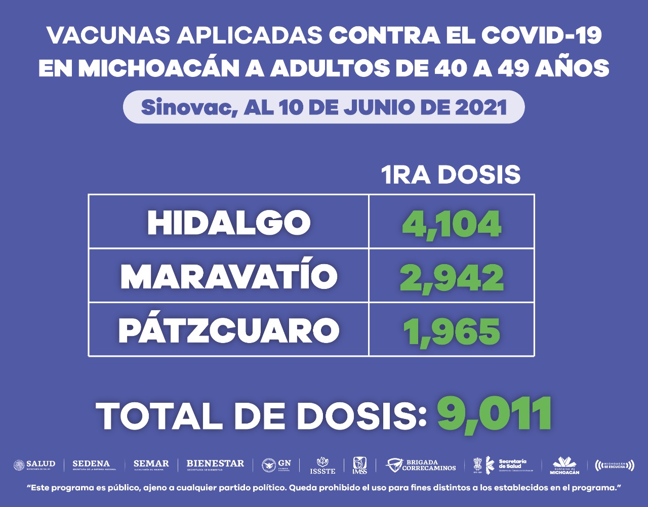 De las dosis aplicadas, 13 mil 219 fueron de AstraZeneca, 184 Pfizer, 536 CanSino y 9 mil 011 de Sinovac, a estas personas se les reitera que deben seguir con el uso del cubrebocas y el lavado o desinfección frecuente de manos.