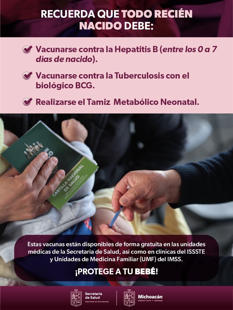 Morelia, Michoacán a 31 de Julio de 2023.- En México y Michoacán, todos los niños recién nacidos deben vacunarse contra la hepatitis B en el primer mes de vida y contra la tuberculosis en los primeros siete días de nacido.