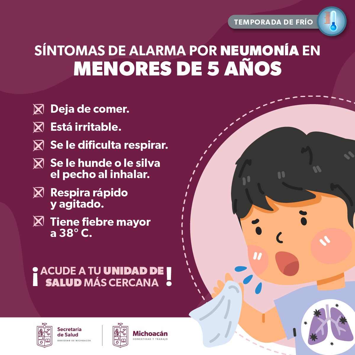 Otros de los síntomas de alerta son: fiebre mayor a los 38 grados Celsius, dificultad y dolor al respirar, irritabilidad en el caso de los niños, el paciente deja de comer, respiración rápida y agitada, tos con flemas verdes o amarillas, por lo que se debe acudir de inmediato al área de urgencias del hospital más cercano.