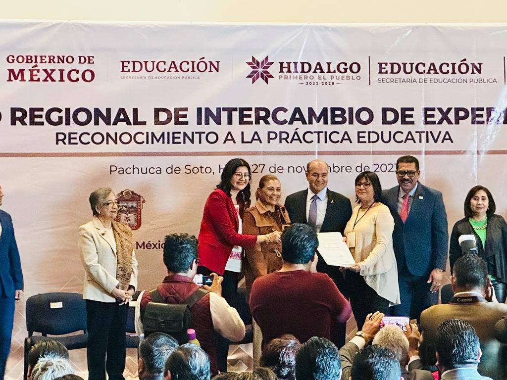 En el marco del séptimo Foro Regional de Intercambio de Experiencias: reconocimiento a la práctica educativa 2023, la docente de la Dirección General de Educación Tecnológica Agropecuaria y Ciencias del Mar (DGETAyCM), Laura Alcántar Sánchez Díaz, recibió de manera presencial la medalla y reconocimiento a la práctica educativa, junto a otros colegas provenientes de Hidalgo, Querétaro y México.