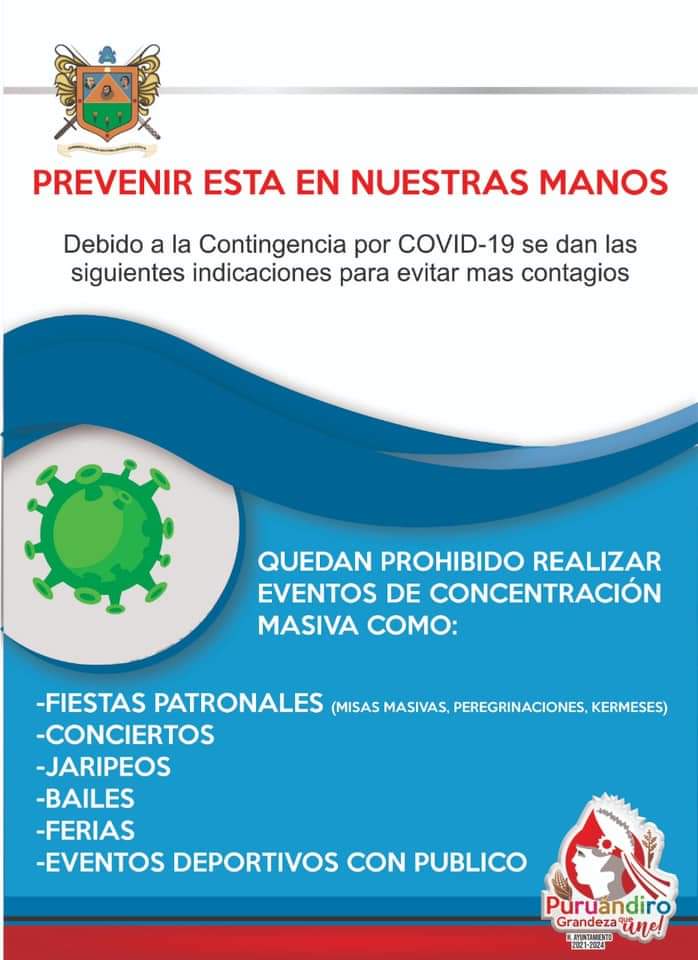 Puruándiro, Michoacán a 10 de Septiembre del 2021.- En atención a las instrucciones recibidas por parte de la Jurisdicción Sanitaria, el Ayuntamiento de Puruándiro que encabeza Víctor Manuel Vázquez Tapia, ha determinado seguir con el establecimiento de medidas restrictivas, con la finalidad de romper la cadena de contagios por Covid-19, en beneficio de la salud de los habitantes del municipio.