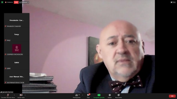 Morelia, Michoacán a 05 de noviembre del 2021.- A fin de reforzar el trabajo con las instituciones educativas del Estado y promover una educación con perspectiva de derechos humanos, no discriminación y no violencia escolar, Gerardo Andrés Herrera Pérez, Director General del Consejo Estatal para Prevenir y Eliminar la Discriminación y la Violencia en Michoacán, impartió a directivos de los planteles del Conalep, Cobaem, Cecytem, la Escuela Federal No. 1 y el DIF del municipio de Apatzingán la conferencia “El camino de la paz y la convivencia social en sostenibilidad”.Dicha actividad realizada de manera virtual tuvo la participación de representantes de organizaciones civiles como Ángel de Corazón, Mujeres de Acero, Fundación el Sol, Deportistas con Causa y Por Amor a mi Tierra Michoacán, activistas sociales comprometidos con la difusión de la cultura de paz.Durante su participación, el titular del Coepredv brindó las herramientas necesarias a los participantes a fin de que la educación en nuestro Estado se imparta desde la perspectiva de los derechos humanos, la no discriminación y la no violencia escolar, enfatizó en que una de las tareas principales de este Consejo es erradicar el maltrato físico y psicológico por discapacidad, apariencia física, forma de vestir, hablar, gesticular o asumir públicamente la preferencia sexual, identidad de género, la expresión de rol de género, o por cualquier otro motivo, lo anterior de acuerdo a la Ley para Prevenir y Eliminar la Discriminación y la Violencia en Michoacán.Destacó que la paz no es solo ausencia de violencia, sino la capacidad de diálogo entre las personas, las comunidades y los países para dar soluciones a los conflictos en equidad y agregó que para la existencia de paz se requiere que sean vigentes los derechos humanos y las libertades, pero también, evitar la violencia física, estructural y cultural, así como avanzar en una participación cívica, social, política que permita la convivencia para lograr fraternidad. “Para lograr la Paz es fundamental trabajar en la creación y desarrollo de conciencia: una conciencia antropológica, que permita en un línea de tiempo, expresar las tenciones, las transgresiones y todo aquello que violenta los derechos y libertades; una conciencia ambiental, que nos interpele en el trabajo cotidiano sobre nuestra responsabilidad y racionalidad ambientalista para evitar la crisis ambiental; la conciencia cívica, es decir, trabajar sobre un modelo de convivencia social, sustentando en el respeto y la tolerancia, en valores, principios y virtudes sociales; y finalmente una conciencia espiritual, que nos convoque al respeto”, finalizó.Finalmente exhortó a los presentes a reconocer cual es el papel que cada uno tiene dentro de la sociedad para poder contribuir a la construcción de la cultura de paz, actuando con justicia y trabajando con ética.