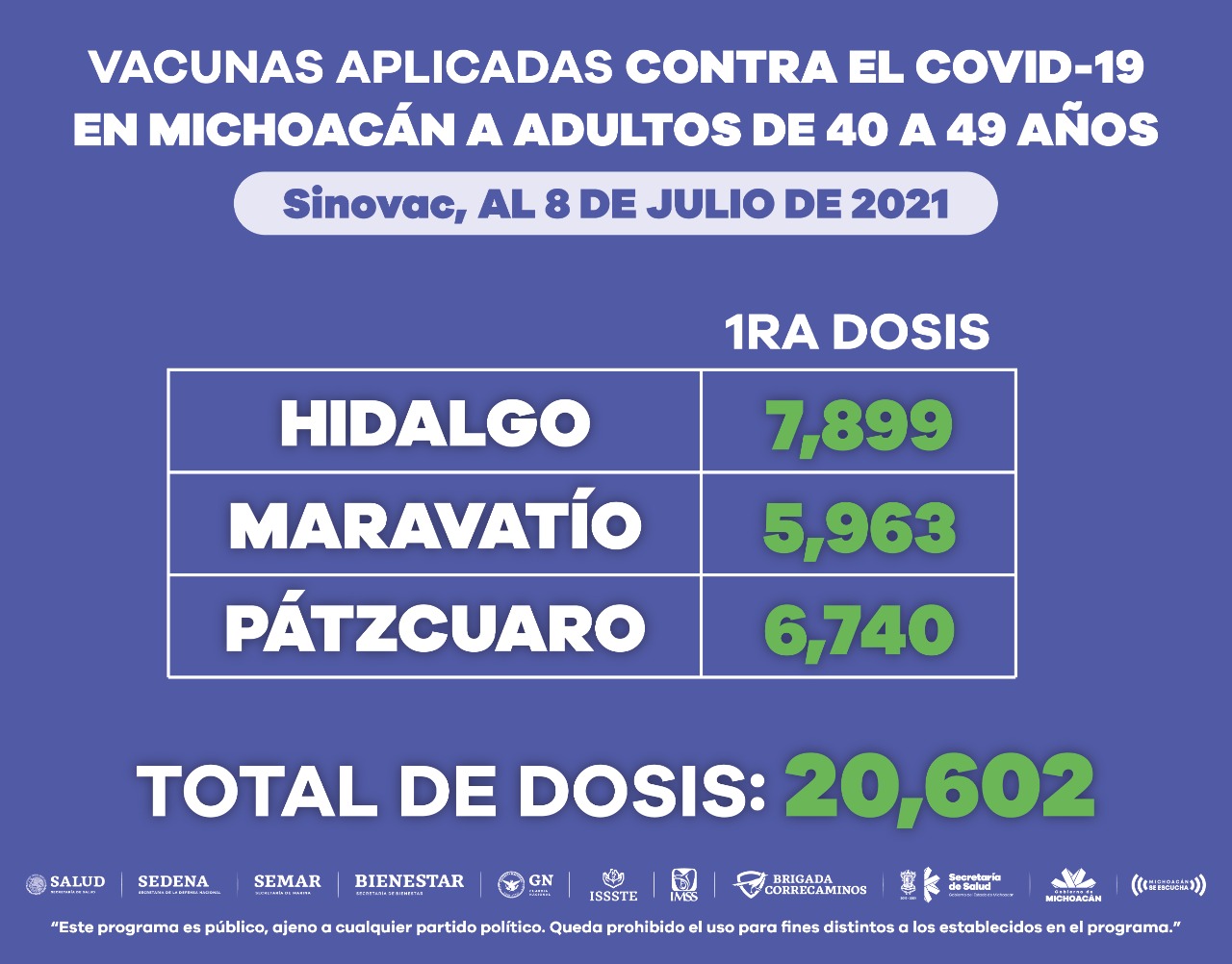 A este sector de la población se le han aplicado 271 mil 405 dosis de vacuna anti COVI-19, de las cuales 92 mil 259 corresponden a AstraZeneca, 9 mil 187 a CanSino, 149 mil 357 a Pfizer y 20 mil 602 a Sinovac.