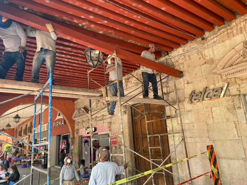 La Piedad, Michoacaàn a 25 de Mayo del 2022.- Con la finalidad de darle mantenimiento y mejoramiento a las instalaciones del Centro Histórico, el Gobierno Municipal de La Piedad a través de la Dirección de Obras Públicas, remplazaron las vigas del Portal Morelos, mismas que por su antigüedad empezaban a representar un riesgo para los ciudadanos.