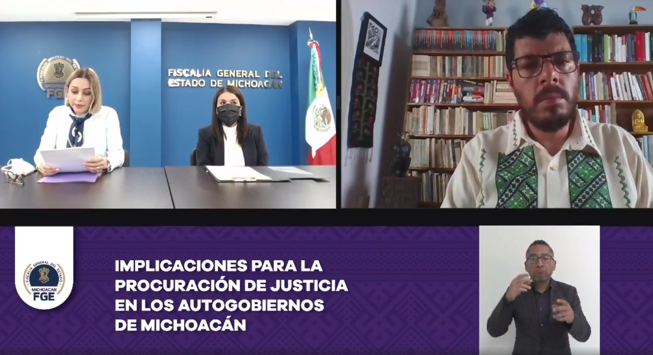 Morelia, Michoacán, a 24 de agosto de 2021.- En cumplimiento a los ejes estratégicos del Plan de Persecución de Delitos para fortalecer las competencias y capacidades del personal, la Fiscalía General del Estado de Michoacán (FGE) llevó a cabo la conferencia “Implicaciones para la procuración de justicia en los autogobiernos de Michoacán”.