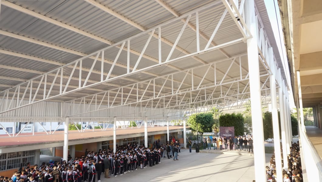 La Piedad, Michoacán a 17 de Enero del 2023.- El presidente Samuel Hidalgo Gallardo, de manera oficial hizo la entrega de la techumbre que se habilitó en el patio cívico de la escuela Secundaria Técnica No. 140 que se ubica en la colonia Ciudad del Sol.