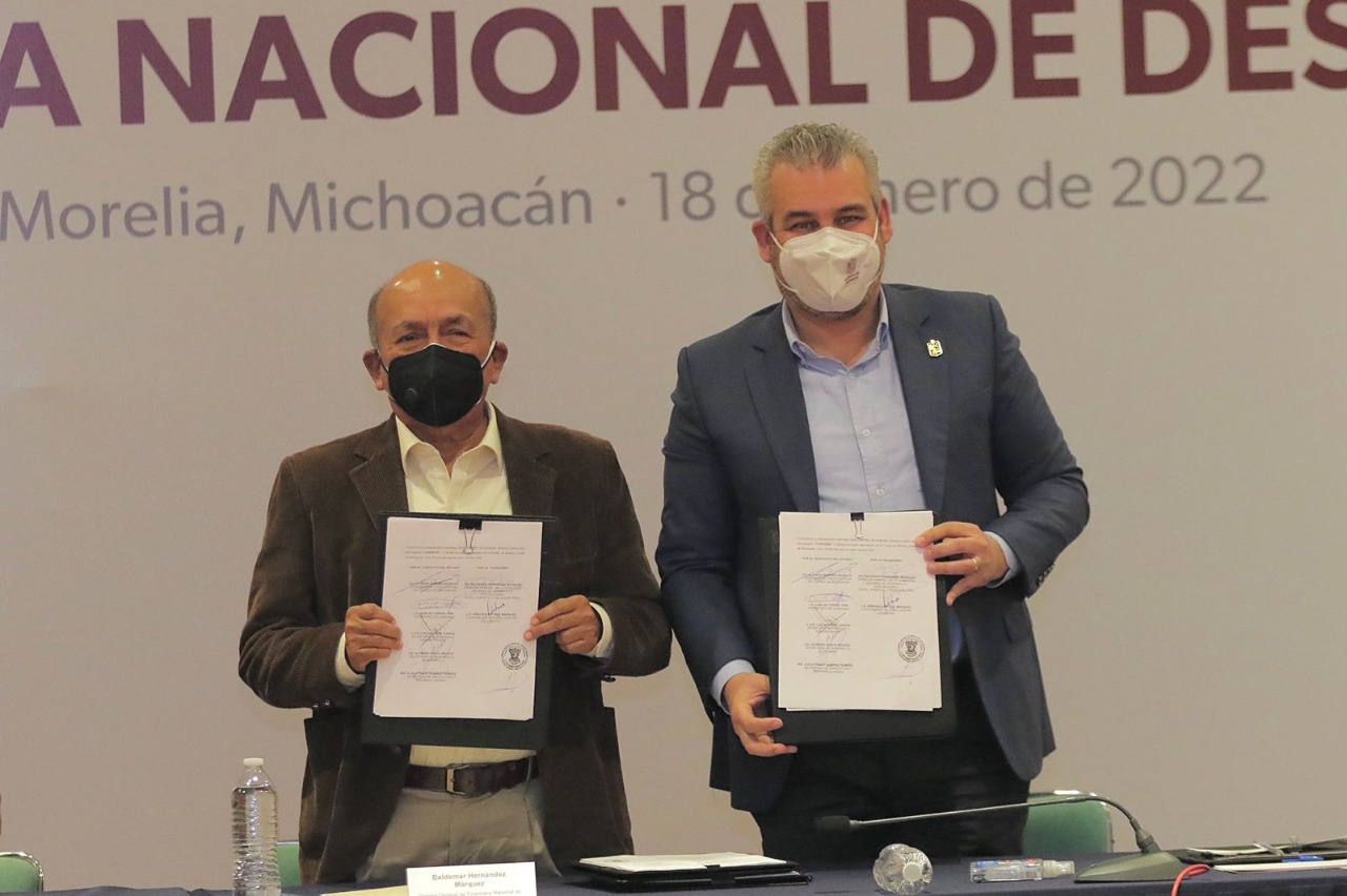 Morelia, Michoacán, 18 de enero del 2022.- El gobernador, Alfredo Ramírez Bedolla, signó un convenio de colaboración con Baldemar Hernández Márquez, director general del Fondo Nacional de Desarrollo Agropecuario, Rural, Forestal y Pesquero (FND), con el que se detonarán recursos de hasta 200 millones de pesos en créditos y fondos de garantía para productores del campo.