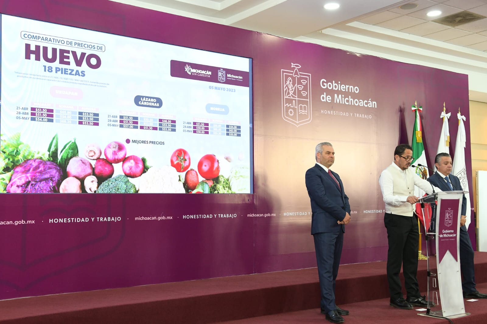 En conferencia de prensa encabezada por el gobernador Alfredo Ramírez Bedolla, el titular de la dependencia estatal indicó que, con base en el monitoreo realizado el 5 de mayo, en el marco de la estrategia Michoacán sin Inflación, el segundo mejor precio se detectó en Morelia, donde los 25 productos que contempla la canasta básica tuvieron un costo total de 989 pesos 20 centavos, en la tienda Chedraui. Le siguieron Uruapan, con 992 pesos ofrecido por Aurrerá; Apatzingán, con un precio de mil 17 pesos 50 centavos, en la tienda Aurrerá; y Zamora, donde se encontró el mejor costo de mil 28 pesos 80 centavos reportado en la cadena Walmart. Respecto al kilogramo de huevo, Méndez Fernández refirió que en la entidad fluctúa entre 51 pesos 30 centavos y 68 pesos 25 centavos, siendo este último el más elevado y se encontró en el establecimiento Soriana. Méndez Fernández reiteró que hay decremento en los índices inflacionarios en Michoacán, tanto el general como el alimentario; respecto a octubre de 2022, el primero ha disminuido 1.7 por ciento, en tanto que el segundo ha tenido un decremento de 3.4 por ciento.