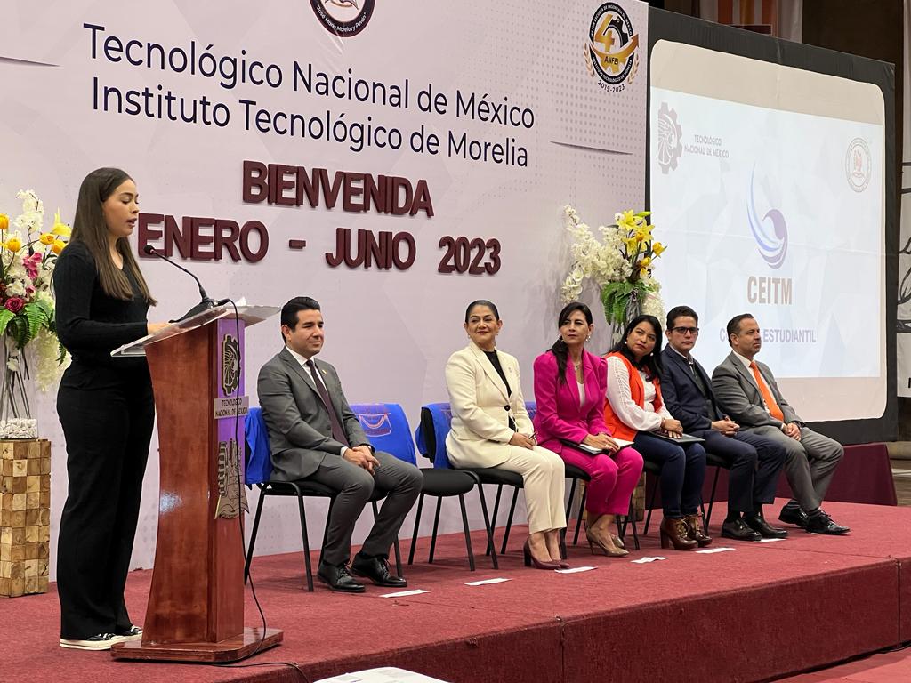 Morelia, Michoacán, 10 de febrero de 2023.- Con un llamado a permanecer en las aulas y culminar sus estudios, la secretaria de Educación en el Estado, Gabriela Molina Aguilar, dio la bienvenida a los jóvenes en el arranque de semestre del Instituto Tecnológico de Morelia.