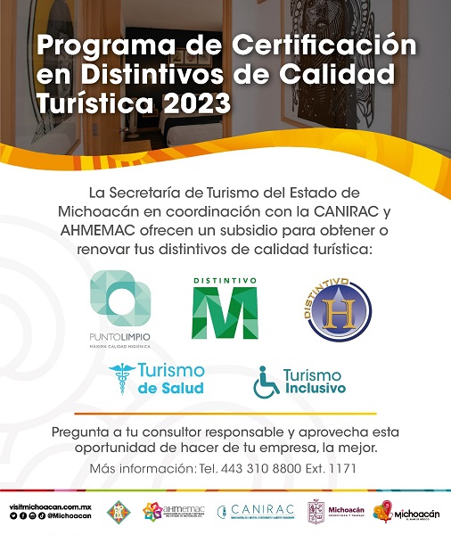Morelia, Michoacán a 20 de Junio de 2023.- El Gobierno del Estado, a través de la Secretaría de Turismo (Sectur), ofrece un subsidio de 3 mil pesos a las empresas interesadas en obtener sellos de calidad que tienen reconocimiento a nivel nacional y respaldan el posicionamiento de los establecimientos en el mercado turístico del país.
