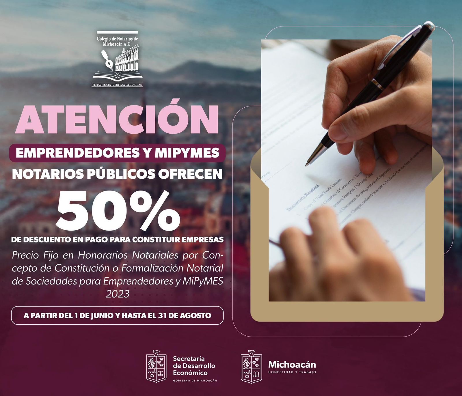 Morelia, Michoacán, 26 de julio de 2023.- La Secretaría de Desarrollo Económico (Sedeco) invita a aprovechar el beneficio del 50 por ciento de descuento para constituir una persona moral, como parte de la alianza estratégica con el Colegio de Notarios de Michoacán.
