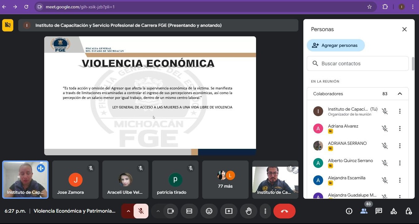 Morelia, Michoacán a 30 de Noviembre de 2024.- Con el objetivo de sensibilizar al personal en materia de los diferentes tipos de violencia existentes, la Fiscalía General del Estado de Michoacán (FGE) impartió la capacitación “Violencia económica y patrimonial en contra de las mujeres”.