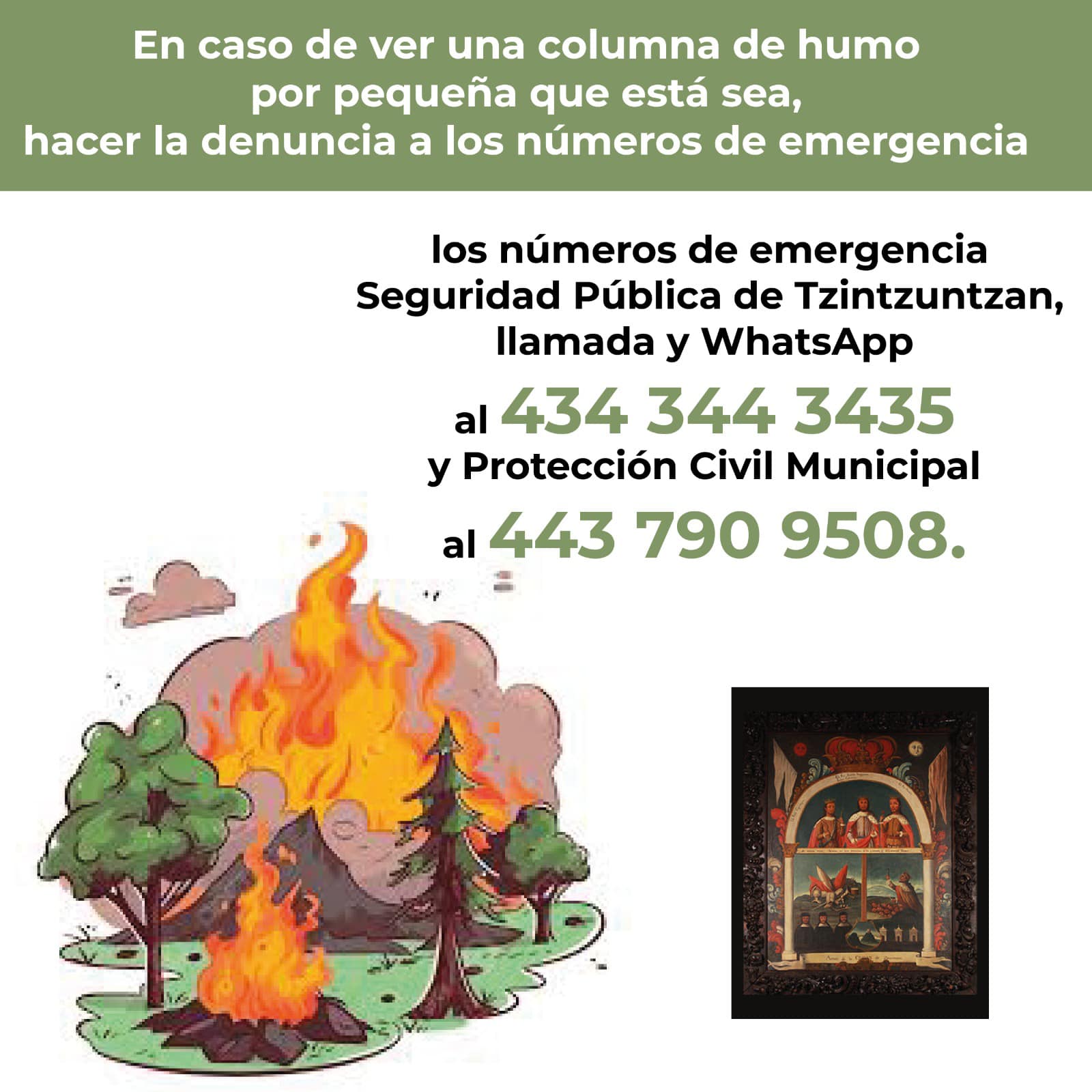 Así mismo indicó que en caso de ver una columna de humo por pequeña que está sea, hacer la denuncia a los números de emergencia como 911, a Seguridad Pública de Tzintzuntzan, llamada y WhatsApp al 434 344 3435 y Protección Civil Municipal al 443 790 9508.