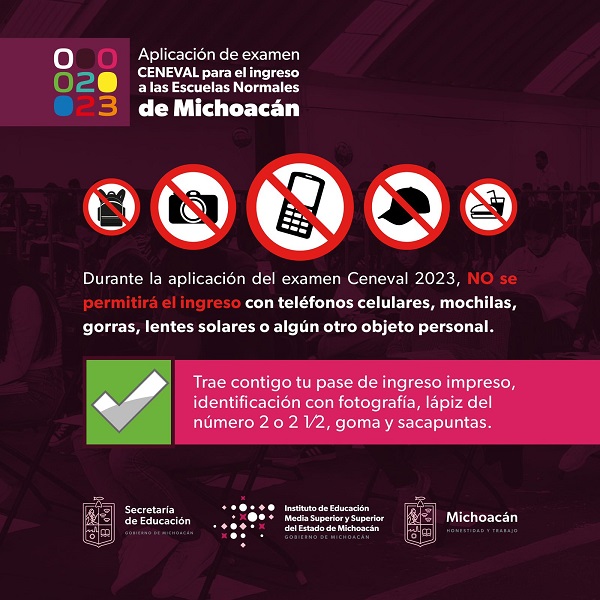 Morelia, Michoacán a 26 de Junio de 2023.- A menos de una semana de llevarse a cabo la aplicación del examen Ceneval para los más de 2 mil 632 aspirantes registrados, el Instituto de Educación Media Superior y Superior del Estado (IEMSySEM) recomienda tomar en cuenta las siguientes disposiciones previo y durante la prueba de conocimientos.