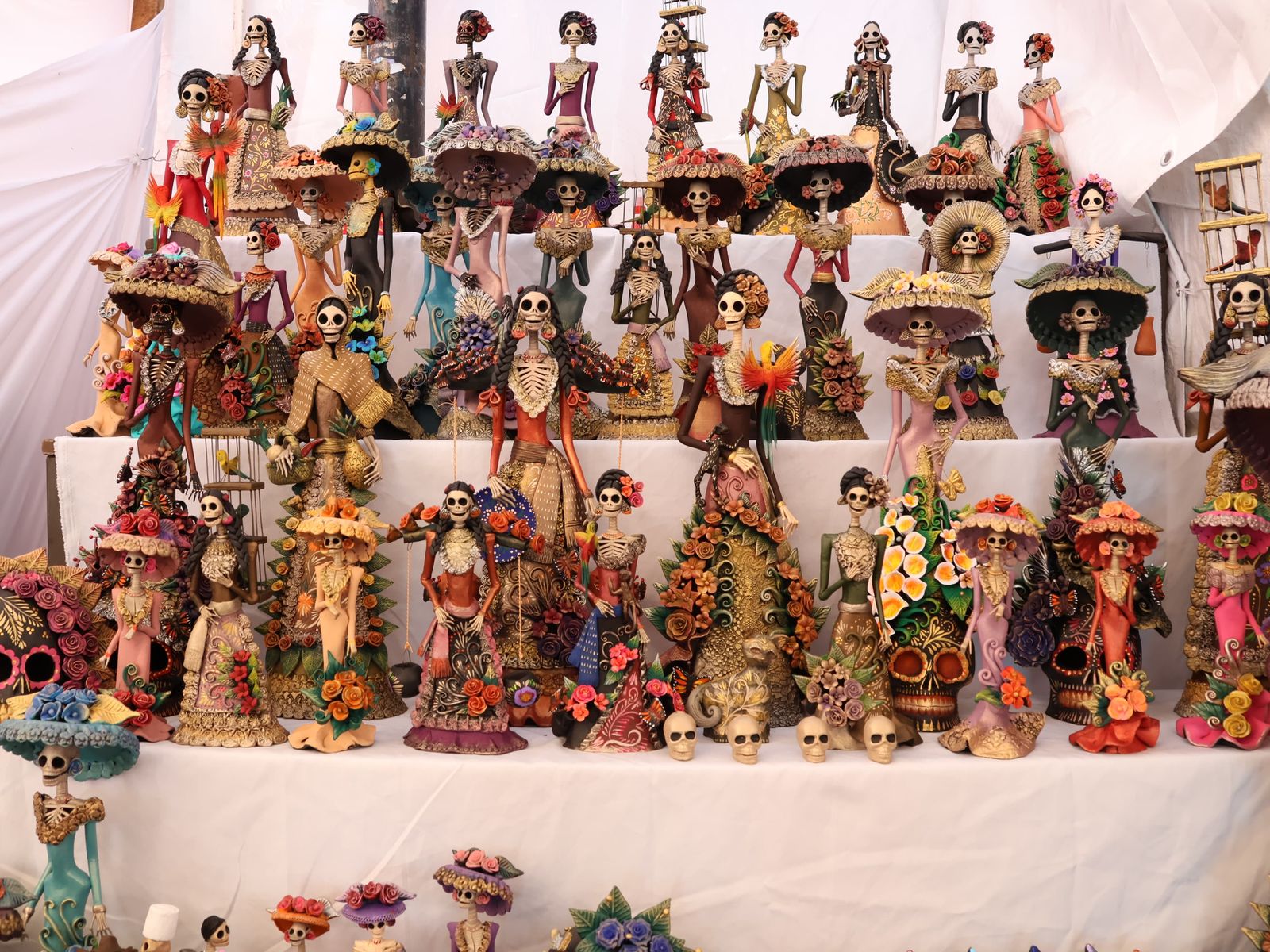Son más de 70 catrinas las que se encuentran en exhibición y venta en la Casa Cultural de esta localidad, de 10:00 a 20:00 horas, en la rama de alfarería policromada, que son aquellas llenas de color, en diversas formas y representaciones como la de vendedor de cempasúchil, que obtuvo el primer lugar del concurso en la categoría de Maestros Artesanos; está también el gallero en caballo y el altar de muertos.