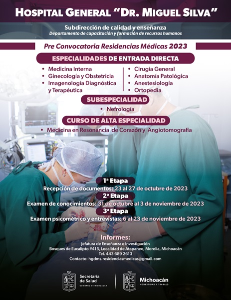 Morelia, Michoacán a 23 de Octubre de 2023.- La Secretaría de Salud de Michoacán (SSM) abrió la recepción de documentos para ingresar a una de las residencias médicas de especialidad y subespecialidad de los hospitales General Dr. Miguel Silva, Infantil Eva Sámano de López Mateos, y de la Mujer, en Morelia.