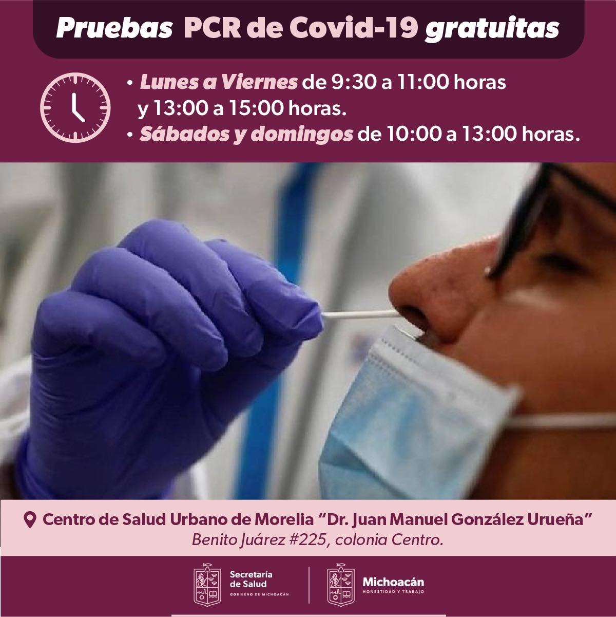 Morelia, Michoacán a 04 de Septiembre de 2023.- Para detectar y atender de manera oportuna a pacientes con COVID-19, la Secretaría de Salud de Michoacán (SSM) continúa con el servicio de pruebas gratuitas en el Centro de Salud Urbano de Morelia Dr. Juan Manuel González Urueña, ubicado frente a la plaza del Carmen.
