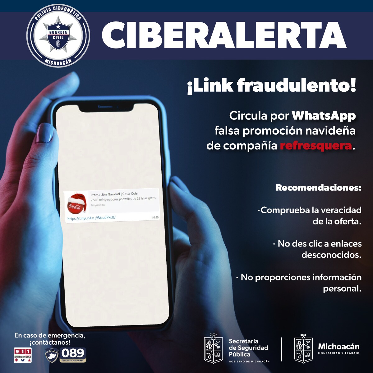 Michoacán, 21 de diciembre del 2022.- Debido a un malware que ronda en las redes sociales, sobre una promoción navideña de la empresa refresquera Coca-Cola y que puede vulnerar gravemente la privacidad de las y los michoacanos, el personal de la Secretaría de Seguridad Pública (SSP) a través de la Policía Cibernética, informa sobre este potencial problema y emite una serie de recomendaciones.