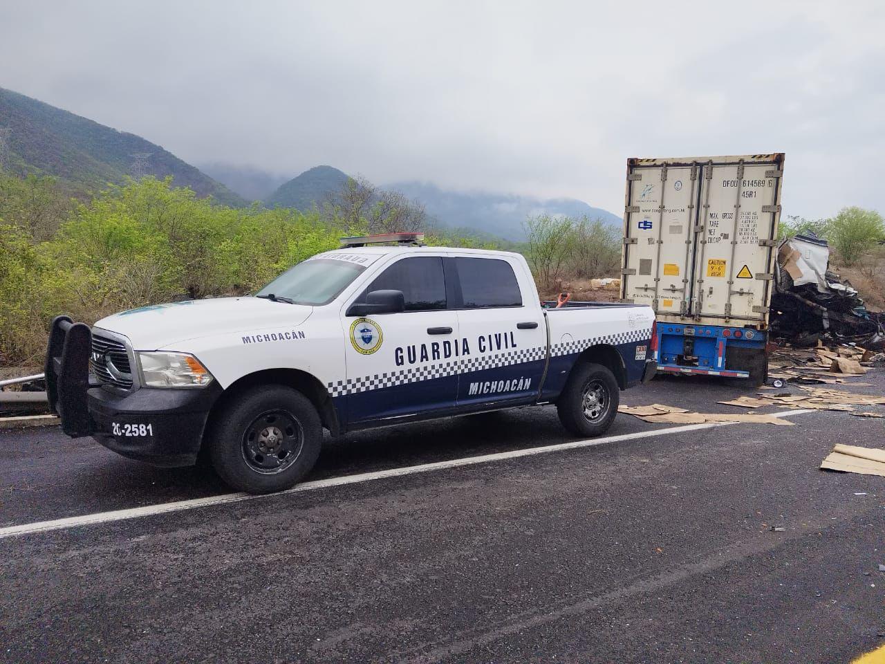 Morelia, Michoacán, 6 de julio del 2023.- Como respuesta a un llamado de emergencia, derivado de un percance vehicular entre dos tractocamiones en la autopista Siglo XXI, los efectivos de la Secretaría de Seguridad Pública (SSP), acudieron en apoyo a los agentes de la Guardia Nacional (GN) para garantizar el orden público.