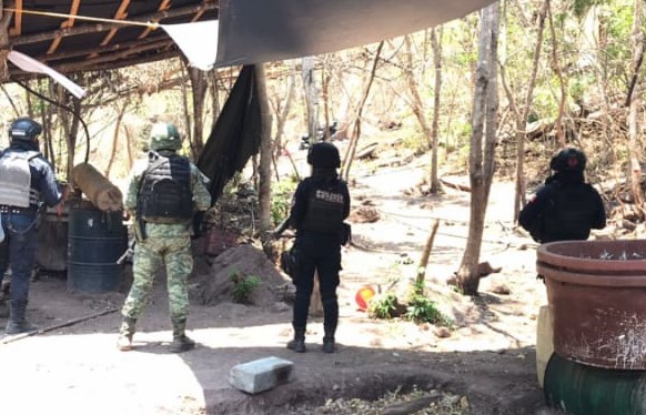 Tumbiscatío, Michoacán, 20 de mayo del 2022.- Como parte de las acciones estratégicas para la disuasión del delito en la entidad, los elementos de las secretarías de Seguridad Pública (SSP), y de la Defensa Nacional (SEDENA), así como de la Guardía Nacional (GN), y Fiscalía General del Estado (FGE); aseguraron y desmantelaron cuatro laboratorios, presuntamente utilizados para la elaboración de drogas sintéticas.