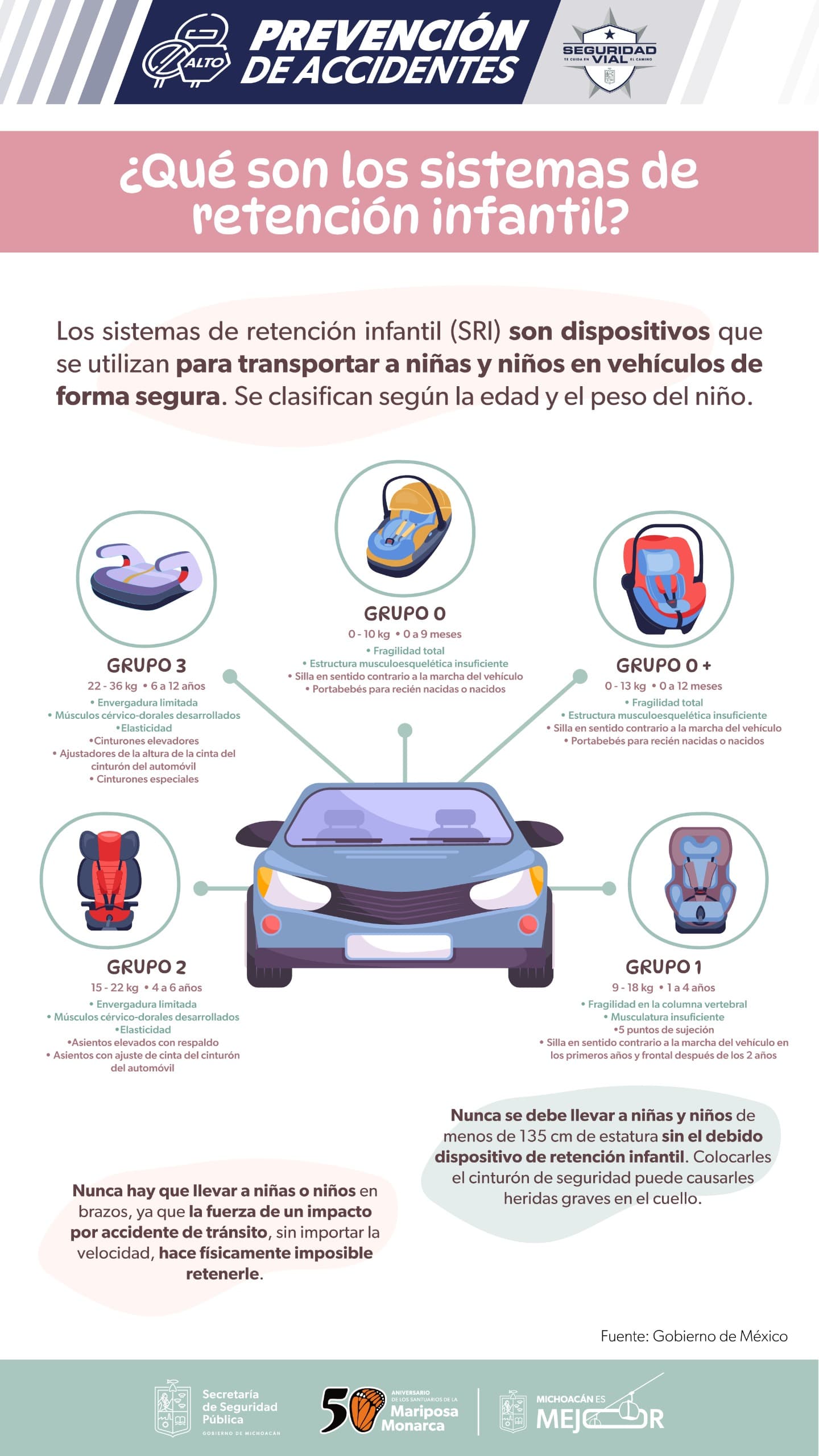 Con el uso de los sistemas de retención infantil se puede garantizar la seguridad de las niñas y niños en el interior del automotor, estos son dispositivos que se utilizan para transportarlos y se clasifican según su edad y el peso, que pueden ser desde los cero meses hasta los 12 años.
