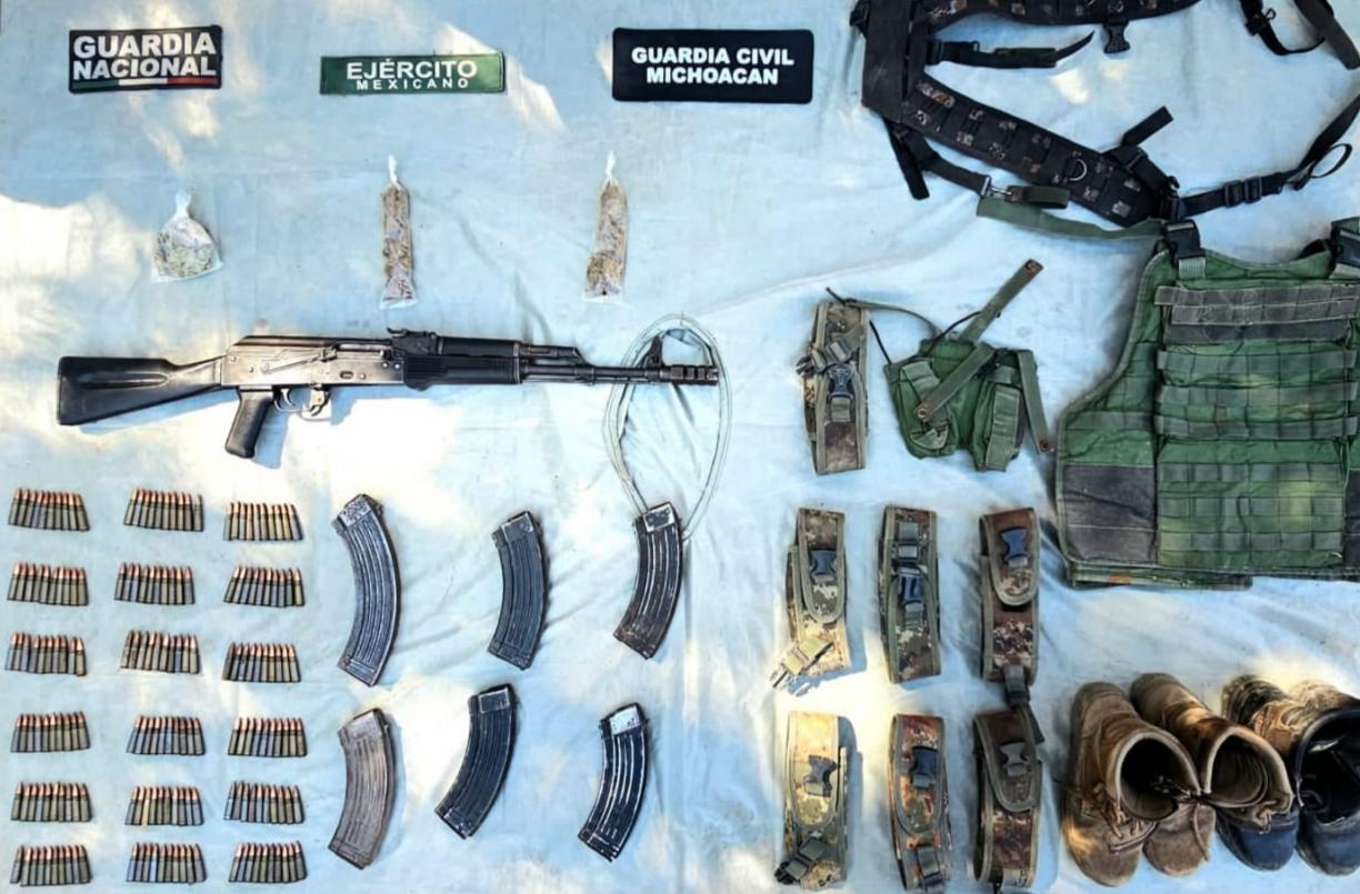 En una segunda acción operativa realizada en la localidad Dos Aguas, municipio de Aguililla, el personal policial y castrense aseguró a una persona en posesión de dos armas de fuego calibres 5.56X45mm, con 200 cartuchos útiles y siete cargadores, así como el equipo táctico.