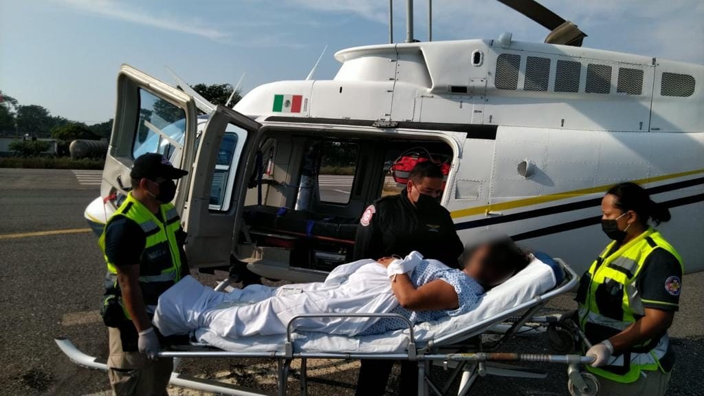 Lázaro Cárdenas, Michoacán, a 3 de diciembre del 2021.- Los elementos de la Secretaría de Seguridad Pública (SSP), en coordinación con el personal de la Secretaría de Salud (SSM), trasladaron vía aérea a una mujer embarazada de un hospital de Lázaro Cárdenas a la capital michoacana.