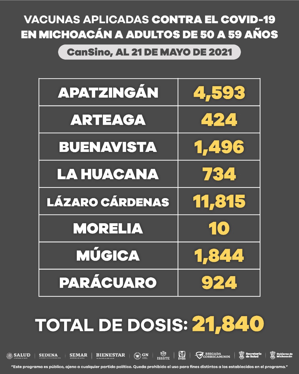 Morelia, Michoacán, a 21 de mayo de 2021.- La Secretaría de Salud de Michoacán (SSM), informa que se han aplicado 117 mil 151 dosis de vacuna anti COVID-19 a personas de entre 50 a 59 años, en diferentes municipios de la entidad.