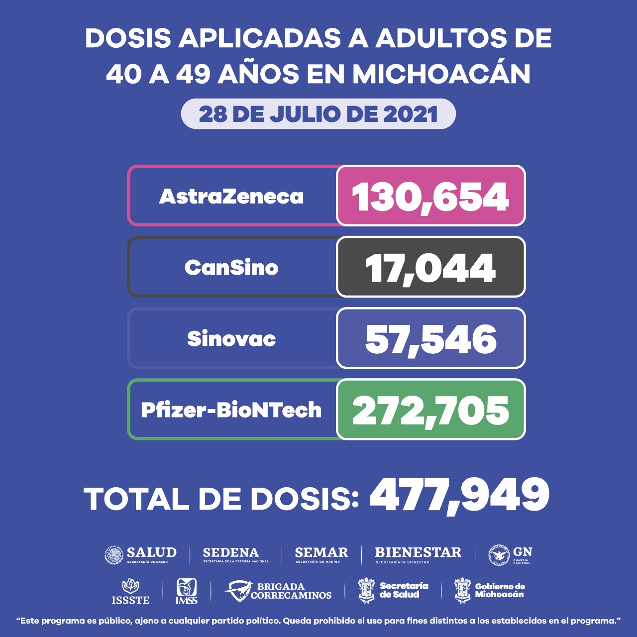 Morelia, Michoacán, a 28 de julio de 2021.-Personal médico, paramédico y de enfermería de la Secretaría de Salud de Michoacán (SSM), ha apoyado en la aplicación de 477 mil 949 dosis de vacuna anti COVID-19 a personas de 40 a 49 años.